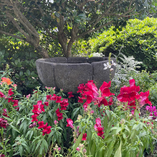 Bit by bit the garden began to take shape. In 2011 we went back to Bali to relax and buy more statues. We bought a stone lotus bowl for a birdbath at our side entrance. The robins love it in winter.