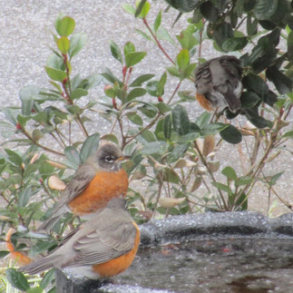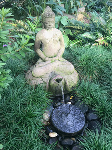 The next summer Charles installed a pool and pump for the Buddha. We decided to surround the pool with rocks and semi-precious gem stones that we had collected from the places we have lived and visited. Delighted birds perched on the Buddha's head and sipped water from the spout. We created a dense garden of leopard plants, hydrangeas, hostas and lilies around the Buddha.